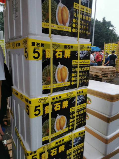 El Mercado Mayorista de Frutas de Cantón también cuenta con una amplia variedad de frutas del sudeste asiático, como el durián congelado de Malasia (en la foto). Estos productos están disponibles durante todo el año y su movimiento es excelente. Sin embargo, la competencia se intensifica cuando el durián tailandés entra en el mercado. El precio del durián tailandés fluctúa, mientras que el precio del durián congelado de Malasia es bastante estable. El durián tailandés fresco se vende por 700-800 yuanes (104,50-119,43 USD) por caja, mientras que el durián congelado de Malasia se vende por 1.650 (246,32 USD) por caja (aunque los precios difieren por marca). El durián malayo se ve afectado por la llegada del durián tailandés, porque el durián malayo es más caro. Otras frutas importadas del sudeste asiático incluyen piñas de Filipinas. Su movimiento se ha ralentizado recientemente.