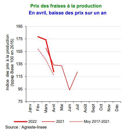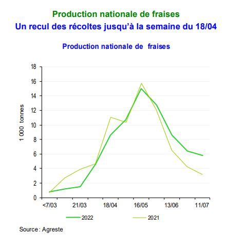 Según las primeras estimaciones a 1 de mayo de 2022, las superficies de fresa en 2022 se mantendrían estables durante un año, con 4.036 ha. La producción francesa anual se estima en 76.000 toneladas, con un ligero aumento del 1% interanual. La temporada de producción de 2022 comienza más tarde, debido al aumento de los costes energéticos para la producción en invernaderos. En términos acumulativos, al final de la semana 18, las cosechas bajaron un 28% interanual; luego se producirá una recuperación gradual, que llevará a cosechas más concentradas en mayo y junio y a una distribución de la oferta menos equilibrada que en 2021, según indica Agreste en su informe.