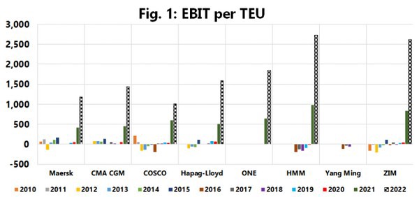 Además, todas las navieras han duplicado con creces su ebit interanual y la mayoría han duplicado su ebit en comparación con sus respectivos ebits combinados desde 2010. Cuatro navieras registraron un ebit en el primer trimestre de 2022 superior a los 5.000 millones de dólares: CMA CGM en primer lugar con 7.640 millones de dólares, seguida de Maersk con 7.070 millones de dólares, COSCO con 6.260 millones de dólares y ONE Line con 5.230 millones de dólares. Para concebir la magnitud de la rentabilidad de las navieras en el primer trimestre de 2022, la figura 1 muestra el ebit/TEU de las navieras que proporcionan datos sobre ebit y volúmenes globales.