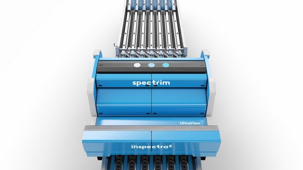 "El módulo de inspección UltraView se integra con Spectrim para llevar su capacidad al siguiente nivel, con un conjunto dedicado de cámaras multiespectrales de alta resolución (color e infrarrojos) y luces led situadas idealmente cerca de la fruta y en paralelo a su dirección de desplazamiento. UltraView puede identificar defectos que, de otro modo, serían difíciles o imposibles de detectar en la zona del pedúnculo y la punta de la fruta".