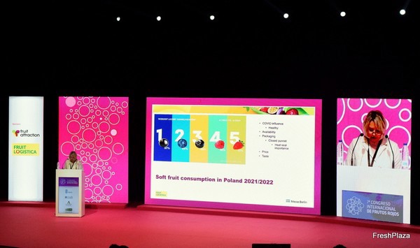 El 7.º Congreso Internacional de Frutos Rojos concluyó ayer tras celebrar una segunda jornada repleta de conferencias. En la mesa de trabajo que abría el programa del 23 de junio, Agnieszka Wryk, de Ewa-Bis, ofreció a través de su ponencia una completa visión del mercado polaco para el sector de las berries, una categoría de fruta que, como ponían de manifiesto las estadísticas presentadas, ha experimentado un rápido aumento en el consumo en Polonia impulsado en este último tiempo por, entre otros factores, la mayor disponibilidad de producto fresco o mejoras en el packaging de estas soft fruits, el COVID y la tendencia a consumir alimentos más saludables.