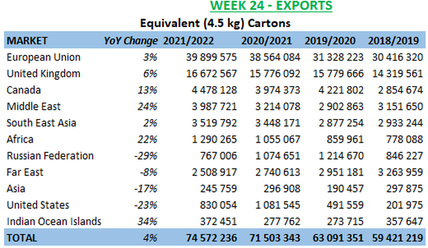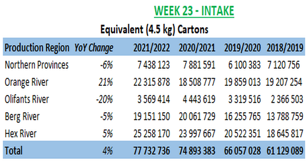 Al comparar el rendimiento regional con la temporada 2020/2021, las zonas del río Orange y el río Hex mostraron los mayores volúmenes inspeccionados con un aumento del 21% y del 5% respectivamente.