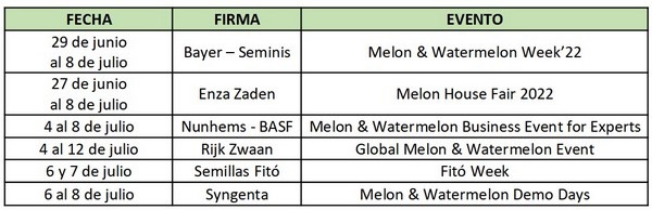 Para mostrar sus novedades, las distintas casas de semillas han organizado su calendario de puertas abiertas a lo largo de esta semana y hasta el próximo 12 de julio. En la Región de Murcia, estas son las principales citas de los eventos de melón y sandía:
