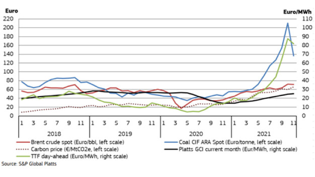 Precios al contado del petróleo, el carbón y el gas en la UE (haga clic aquí para ampliar la imagen) Fuente: https://energy.ec.europa.eu/system/files/2022-01/Quarterly%20report%20on%20European%20gas%20markets%20Q3_2021_FINAL.pdf
