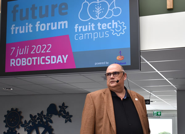 Como ponente principal, Han Fleuren, de Fruit Tree Nursery Fleuren, reflexionó sobre el posible impacto de la cosecha robotizada en la agricultura del futuro. Lo hizo llevando a los presentes a un viaje por los 100 años de historia de la empresa familiar, que fue fundada por su abuelo, y en la que él ahora vende, además de árboles frutales, el miniárbol y sistemas de medición para el huerto. Fleuren también relató su experiencia con un cultivo de cerezas que encontró en Chile, dispuesto al estilo de los kiwis, lo cual permitía que las cerezas colgaran. "Seguro que eso suena como música para los oídos de los robotizadores. ¿Funcionará también para la fruta de pepita? Ni idea, pero el futuro no va de quién es el más fuerte o el más inteligente, sino de quién se adapta mejor", dice Han.