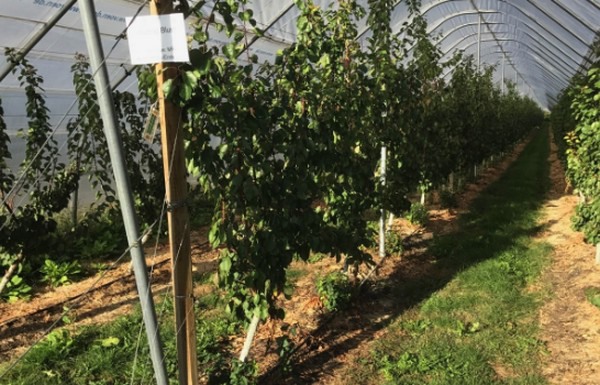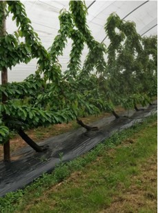 Foto: Cerezos en un sistema Drapeau con tablero en la parte inferior para el soporte del marco