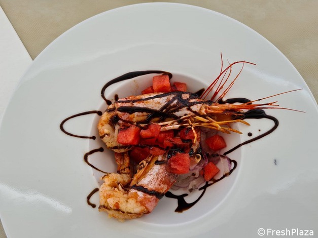 Las creaciones del chef Spadoni, que usó Dolce Passione para todos los platos del almuerzo, han sido las siguientes: camarones salteados con cebolla de Tropea, vinagre balsámico y bocados de sandía como aperitivo, risotto con gorgonzola y sandía como primer plato, ensalada templada de pollo y sandía como segundo plato y mousse de sandía con yogur como postre.