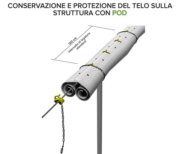 PolyFilm-Ultra se suministra de acuerdo con las normas europeas EN 13206 con alta resistencia a la radiación solar, igual a 500 KLY, correspondiente a la clase E. La película se utiliza solo para los meses de enero, febrero, marzo y abril, dando lugar a una exposición total de 47,8 KLY (datos recogidos en la latitud de Bari). La vida útil de la película es, por tanto, de unos 10 años. Una vez cosechadas las cerezas, la cubierta se recoge y almacena, envuelta y protegida por una lámina protectora blanca POD (ver catálogo páginas 18 y 19).