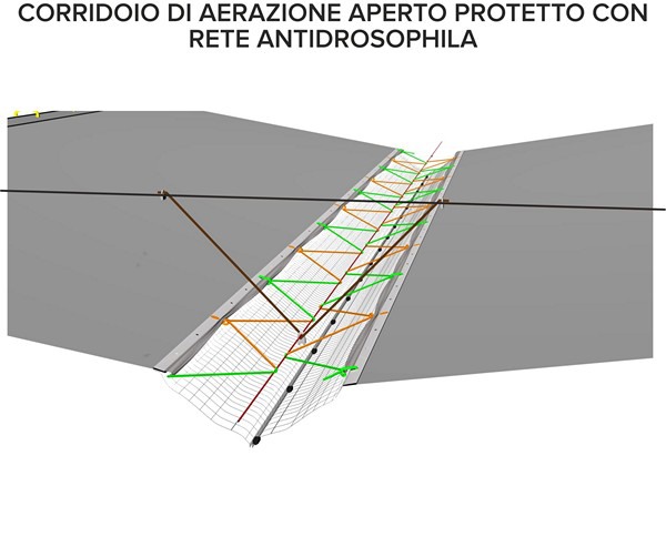 "Esta técnica de refuerzo permite la regulación de la circulación del aire, ya que la apertura del pasillo central se puede ajustar manualmente entre un ancho de 0 y 100 cm (ver catálogo en las páginas 14 y 15). La temperatura óptima es la de entre 22 y 28 °C. La fase más delicada es la floración y el consiguiente cuajado, cuando el pasillo de aireación debe estar completamente abierto para crear un clima bastante seco. Aunque la película en el corredor central se abre para favorecer la ventilación, el huerto siempre está protegido por mallas antigranizo o anti-Drosophila, que se unen a la película gracias a un proceso de costura a lo largo del refuerzo (ver página 13)".