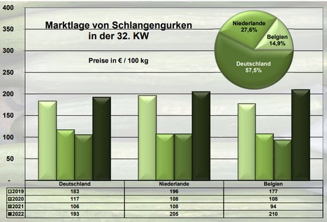 La oferta holandesa y de cultivo local dominó el mercado de los pepinos en los mercados mayoristas alemanes en la semana 32 y estuvo a un nivel de precios notable. Los altos precios se debían a las difíciles condiciones de producción por la sequía y al aumento de los costes a lo largo de toda la cadena de valor, de acuerdo con la Agencia Federal para la Agricultura y la Alimentación de Alemania (BLE). Los pepinos belgas aparecieron en gran número solo en Fráncfort del Meno y, en menor medida, en Múnich. Aunque la disponibilidad era limitada, la oferta pudo cubrir la demanda que en varias ocasiones se había limitado debido al período de vacaciones.