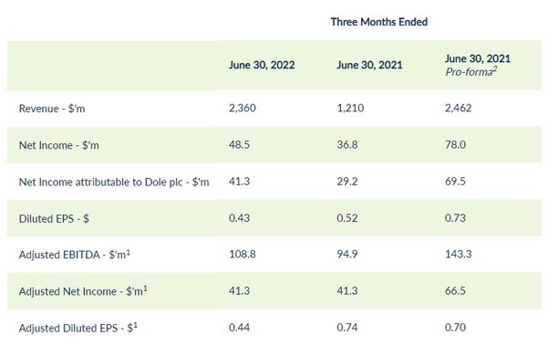 Dole plc ha publicado sus resultados financieros para el trimestre y semestre terminados el 30 de junio de 2022.