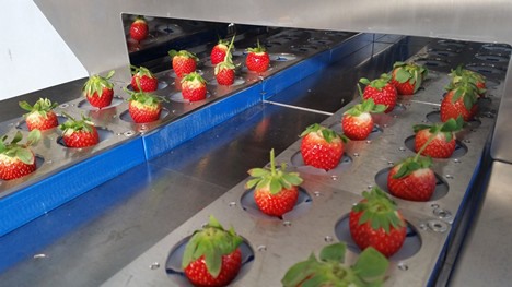 Fresas con pedúnculo entrando en la máquina de corte
