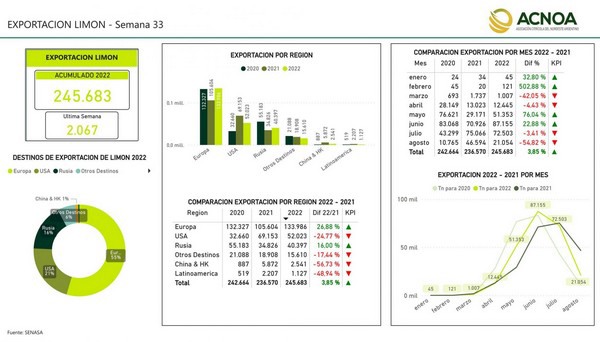 Comparando la actual exportación de limones de 2022 con la temporada pasada (2021), solo Europa (26,88%) y Rusia (16%) vieron incrementados sus volúmenes. Los otros grandes mercados para los limones argentinos, es decir, Estados Unidos (-24,77%) y otros destinos (-17,44%) experimentaron descensos. Los mercados más pequeños registraron grandes descensos, aunque partiendo de bases más bajas: China y Hong Kong, un -56,7%, y Latinoamérica, un -48,94%.