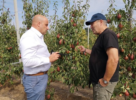 Kris Jans, director de la División de Frutas de BelOrta, hablando con Hugo Cuvelier, productor de Fred, acerca de la evaluación del tamaño de la fruta antes del inicio de la cosecha.