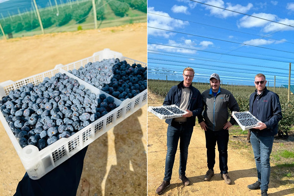 Maxim De Roeck y Kevin Smedts, de Fruitful-Berries, visitando a su productor de arándanos de ultramar.