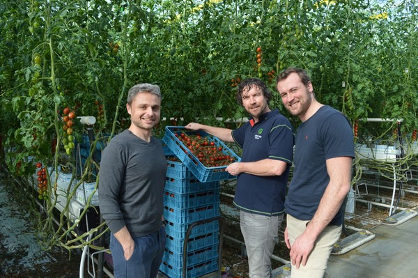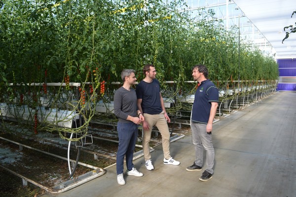 Rien Kamman, Paul Grootscholten y Ernst van Bruggen en uno de los invernaderos de Agro Care que son impulsados por inteligencia artificial con la ayuda de Source.ag.