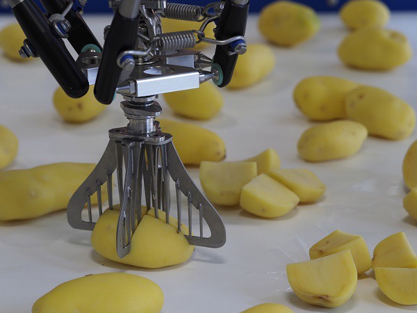"Todavía se utilizan muchas máquinas de procesamiento de fresas en las que hay que colocar la fruta manualmente. Eso, obviamente, aumenta los costes de mano de obra. E incluso en las cortadoras en las que se pueden introducir las fresas de forma aleatoria, sigue habiendo entre un 20 y un 30% de pérdidas. Nuestras pérdidas son menores que con el trabajo manual; además, trabajamos cinco veces más rápido. Cada robot, con la D-Blade, puede cortar entre cuatro y cinco patatas por segundo, igual de rápido o más que las máquinas convencionales. Pero estas nunca, por ejemplo, cortan las patatas peladas al vapor por la mitad", presume Bart.