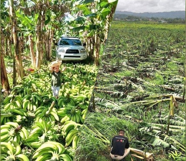 Un joven agricultor frente a lo que ha quedado de su plantación de bananos. Aunque la imagen se tomó en Puerto Rico, muestra el impacto devastador de un huracán. Fuente: Twitter.