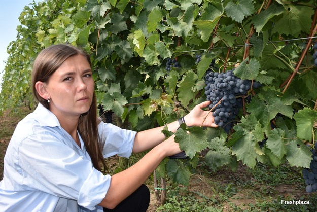 Tatiana muestra un precioso racimo de uvas Moldova