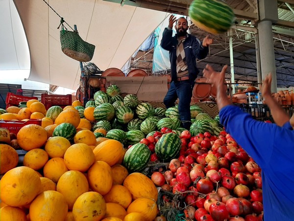 FreshPlaza estuvo caminando por el zoco Souk el Had de Agadir viendo la diversidad de fruta y hortalizas. En la imagen, un puesto con sandías, melones y granadas.