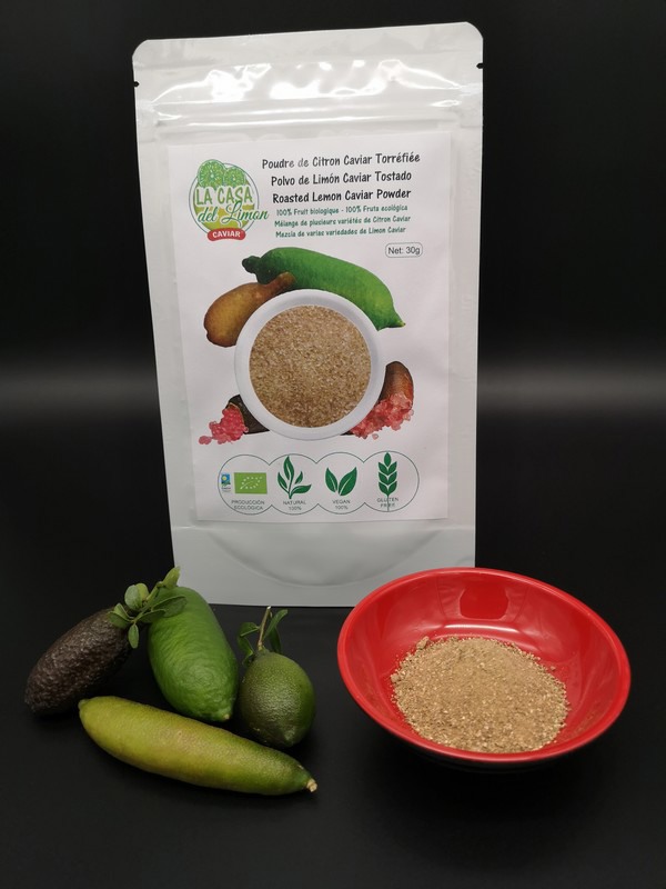 “El polvo de caviar de limón tostado es un producto único en el mundo que elaboramos a partir de algunos de nuestros limones de caviar. Se utiliza sobre todo en la cocina de alta gama y en la pastelería, y se emplea de forma muy diferente al limón de caviar. Los chefs de los mejores restaurantes adoran este producto, que es difícil de trabajar; pero es normal que lo hagan”, afirma Thierry. “Actualmente estamos desarrollando otros productos elaborados a partir de diversas variedades de nuestros limones de caviar, que llegarán en unas semanas”.
