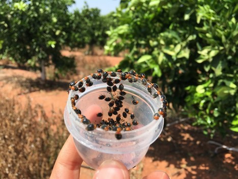Suelta en campo de Cryptolaemus montrouzieri criados en el insectario de Frutínter, enemigo natural de Planococcus citri o cotonet.