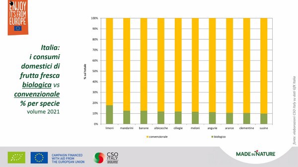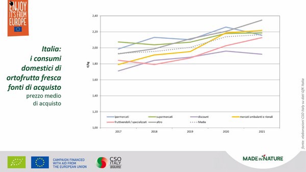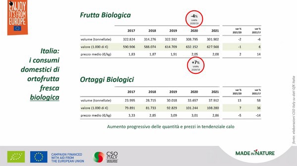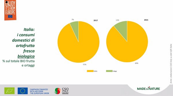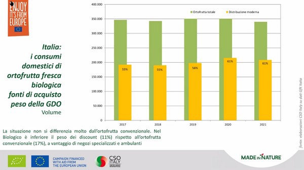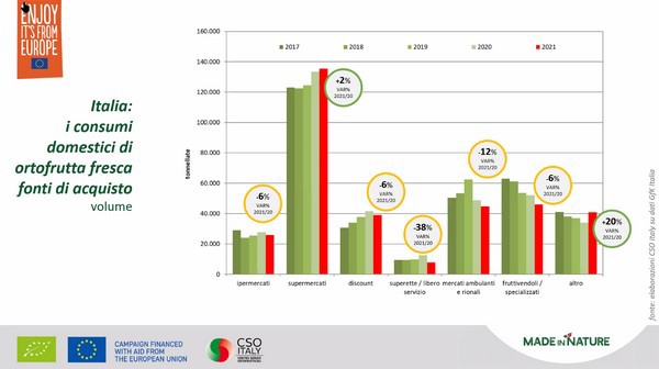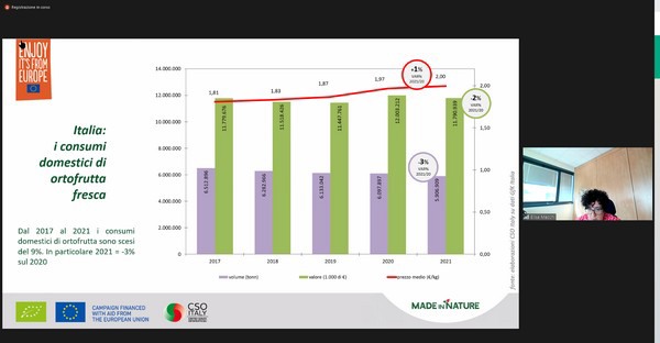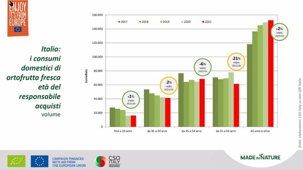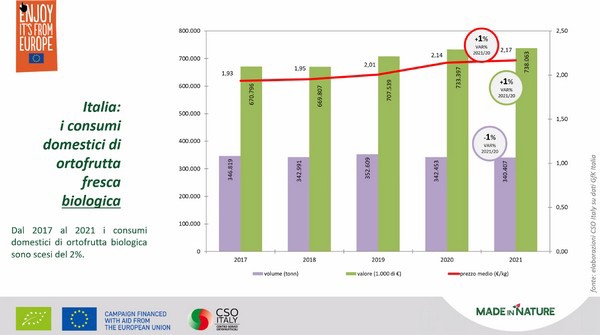 "No estamos pasando por un buen momento, en cuanto al consumo de frutas y hortalizas en Italia: de 2017 a 2021 las compras de las familias han sufrido un descenso progresivo (-9%). Hemos pasado de unos 6,5 millones de toneladas a poco más de 5,9 millones. En particular, en 2021 hemos visto una reducción del 3% en comparación con 2020. Al mismo tiempo, el precio medio en los puntos de venta está aumentando", comentó Elisa Macchi, directora de CSO Italy, durante un almuerzo de prensa digital, organizado para presentar la nueva campaña de Made in Nature, un proyecto cofinanciado por la Unión Europea y orientado a promover el cultivo ecológico en Italia, Francia, Alemania y Dinamarca.