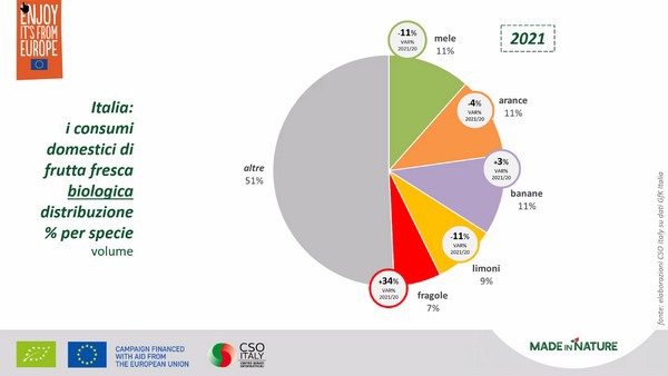 "Dentro de la categoría de frutas ecológicas, los principales productos consumidos son manzanas, naranjas, bananas (con una participación del 11% cada uno), limones (9%) y fresas (7%), que en conjunto representan casi el 50% de las compras de fruta ecológica en Italia. En 2021, la fresa y la banana registraron un aumento del 34% y 3% respectivamente con respecto a 2020. Los demás productos muestran una caída", subrayó Macchi.