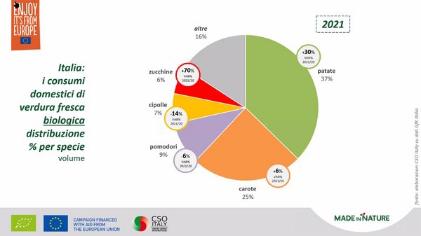 "En cuanto a las hortalizas, en 2021 el 37% de las compras ecológicas corresponden a patatas. Les siguen las zanahorias (25%), los tomates (9%), las cebollas (7%) y los calabacines (6%). Estos 5 productos representan más del 80% del consumo de hortalizas frescas ecológicas en Italia. En comparación con el año anterior, hay un crecimiento en patatas, zanahorias y calabacines".
