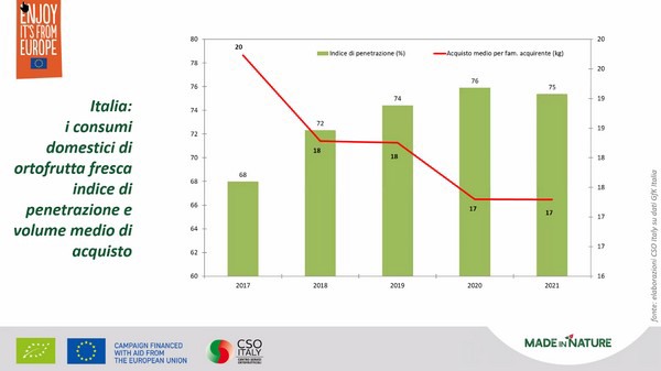 "No estamos pasando por un buen momento, en cuanto al consumo de frutas y hortalizas en Italia: de 2017 a 2021 las compras de las familias han sufrido un descenso progresivo (-9%). Hemos pasado de unos 6,5 millones de toneladas a poco más de 5,9 millones. En particular, en 2021 hemos visto una reducción del 3% en comparación con 2020. Al mismo tiempo, el precio medio en los puntos de venta está aumentando", comentó Elisa Macchi, directora de CSO Italy, durante un almuerzo de prensa digital, organizado para presentar la nueva campaña de Made in Nature, un proyecto cofinanciado por la Unión Europea y orientado a promover el cultivo ecológico en Italia, Francia, Alemania y Dinamarca.