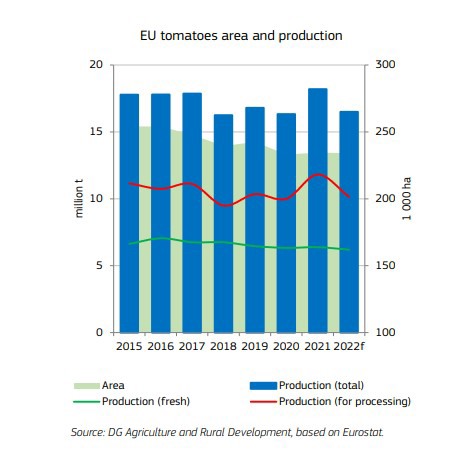 Si bien los precios altos del tomate son buenos para los productores, los costes de producción también son elevados, mientras que los volúmenes de producción son más bajos este año. Se espera que la producción de tomate en la Unión Europea caiga un 9% este año, según cálculos realizados este verano. En los últimos cinco años, la producción media aumentó un 3% cada año.