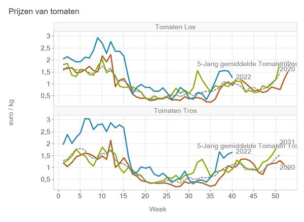 También en la región de Flandes, que no está incluida en el dashboard sobre tomates, se aprecia un aumento de los precios desde principios de septiembre, aunque no tanto en la segunda mitad del mes pasado. El precio medio, tanto de los tomates sueltos como de los tomates en rama, se ha mantenido en torno a los 1,50 €. En el segmento de los tomates sueltos, el precio mostró una caída a principios de octubre. Con el invierno acercándose, los países del centro y del norte de Europa volverán a importar muchos tomates de los invernaderos del sur de Europa, los tomates sueltos en particular, puesto que los productores holandeses y belgas están más especializados en tomates en rama. No obstante, con la crisis energética en pleno apogeo, se espera que los volúmenes sean mucho más bajos en Países Bajos y Bélgica. Sin duda, esto hará que el tomate en rama sea más exclusivo y más caro.