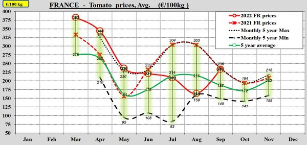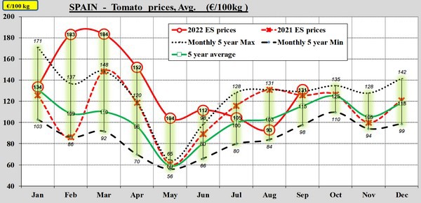 En general, un kilo de tomates alcanzó una media de 1,43 € en el mes de septiembre en Europa, cercana al precio récord establecido el año pasado. El precio fue en parte determinado por los volúmenes más bajos como resultado de problemas de virus.