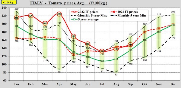 Al igual que en los Países Bajos, el aumento porcentual de los precios del tomate en Italia en el mes de septiembre ha sido un 12% más bajo que en los últimos cinco años.