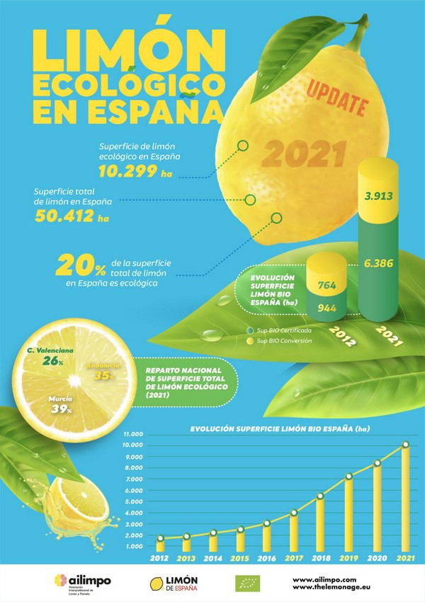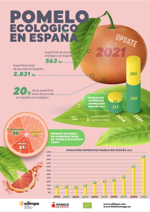 La superficie de limón ecológico cultivado bajo el modelo europeo en España alcanzó en 2021 las 10.300 hectáreas, aumentando un 503% respecto a 2012. En cuanto al pomelo bío, su superficie ha crecido un 327% desde 2012 alcanzando actualmente las 563 hectáreas. Tanto en limón como pomelo, el cultivo ecológico representa un 20% de la superficie total de cada uno de los cultivos.
