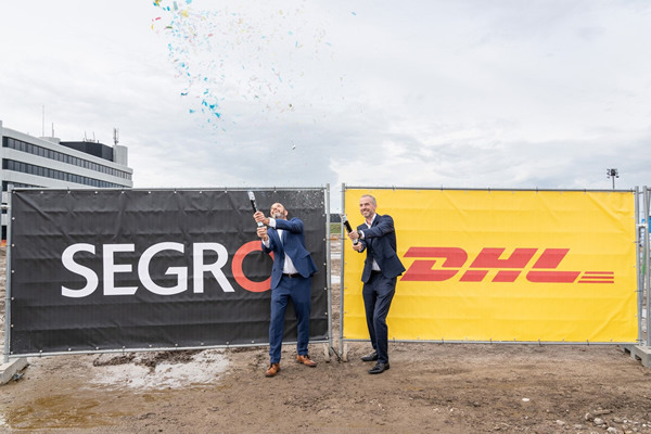 Eelco Ouwerkerk, de Segro Nederland (izquierda), y Henk Venema, CEO de DHL (derecha), celebrando el comienzo de la construcción
