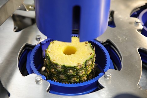 "Con una dimensión de aproximadamente 1,5 m x 1,5 m, la máquina PINCYL8 permite obtener cilindros de piña a nivel industrial. Simplemente girando un selector, también se pueden obtener cubos, rodajas o cuñas de piña. La máquina ha tenido mucho éxito en Europa y América en los últimos 24 meses. Con su procesado de 12 frutas por minuto y diseño robusto, fácil de higienizar y confiable, la troqueladora de piña PINCYL8 tiene éxito en varios mercados y es la máquina más solicitada en este periodo".