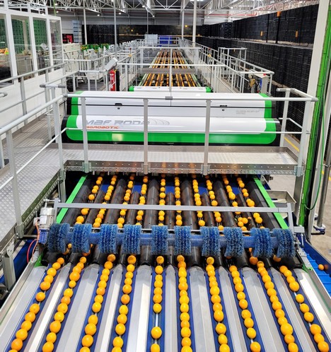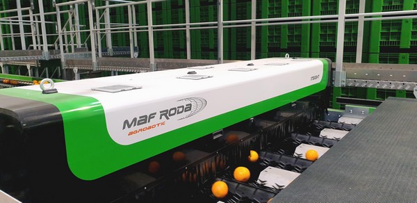 Por ejemplo, una línea de precalibrado estándar de Maf Roda puede llegar a procesar cientos de toneladas al día gestionada con tan solo 5 operarios. "Esto permite una clara reducción de los costes de mano de obra y una amortización rápida de la instalación, ya que posibilita poder doblar turnos con mucha más facilidad. Sin embargo, cuando hablamos de automatización completa de los procesos de una central citrícola no nos centramos exclusivamente en las líneas de precalibrado y confección como podríamos imaginar con sistemas como la Pomone IV, o en el análisis de calidad y detección de defectos externos con el Globalscan 7 – Viotec y niveles de Brix con el Insight de Maf Roda; sino que nos extendemos al trasiego de cajas y bins por el almacén con los nuevos vehículos autónomos, conocidos como AGV, o la gestión de la eficiencia y productividad del almacén con sistemas basados en GMAO y OEE".