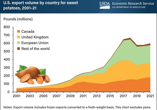 La promoción de los beneficios del tubérculo para la salud y la ampliación de la oferta de batatas por parte de las empresas alimentarias, como las batatas fritas y los chips de batata, han ayudado a impulsar la expansión. Las exportaciones al Reino Unido y a la Unión Europea experimentaron un fuerte crecimiento interanual desde mediados de la década de 2000 hasta 2018. El aumento de la competencia mundial y los daños causados por el huracán Florence a la cosecha de 2019 en Carolina del Norte (el estado que lidera la producción estadounidense) enfriaron el mercado de exportación. De 2018 a 2021, las exportaciones disminuyeron al Reino Unido en un 28% y a la Unión Europea en un 12%. Por otro lado, las exportaciones han seguido aumentando a Canadá, entre otros destinos.