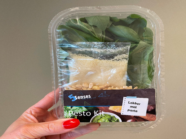 La empresa holandesa Europe Retail Packing BV, de Poeldijk, tiene disponible en los Países Bajos un kit con los ingredientes necesarios para elaborar pesto a partir de esta semana y a tiempo para la época navideña. Contiene ingredientes frescos de primera categoría y recolectados a mano, como albahaca genovesa, aceite de oliva virgen extra, piñones y una mezcla de frutos secos, queso parmesano curado y ajo fresco.