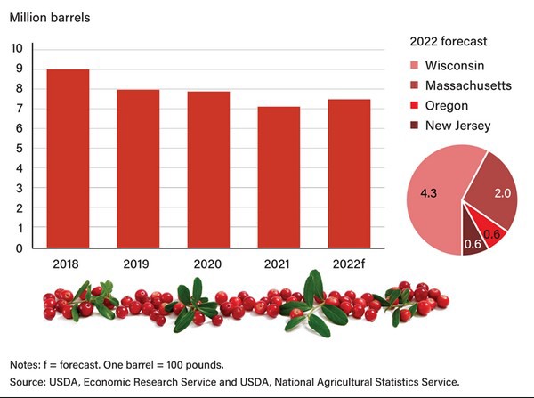 Se esperan mayores cosechas en todos los estados, pero sobre todo en Massachusetts, donde se prevé una producción de 2 millones de barriles, un 11% más que el año pasado. Según la NASS, los productores de Wisconsin y Massachusetts informaron de que la cosecha experimentó frío, humedad y granizo a principios de la temporada de desarrollo, lo que retrasó la temporada de plantación. Sin embargo, la subida de las temperaturas y la mejora de las condiciones meteorológicas ayudaron a las plantas y a las berries a desarrollarse.