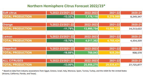 La Organización Mundial de Cítricos (WCO) ha publicado su pronóstico anual de cítricos del hemisferio norte para la próxima temporada de cítricos (2022-23). El pronóstico, que se presentó durante la tercera edición del Global Citrus Congress el 30 de noviembre de 2022 en línea, se basa en datos de Egipto, Grecia, Israel, Italia, Marruecos, España, Túnez, Turquía y Estados Unidos (basado en informes del USDA para Arizona, California, Florida y Texas). Este año, el pronóstico muestra que se proyecta que la producción de cítricos alcance las 25.958.275 toneladas, lo que representa una disminución del 13% en comparación con la temporada anterior.