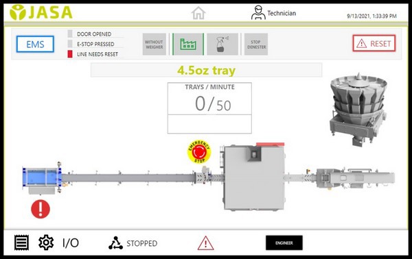 Otra ventaja significativa de la HMI es que la interfaz muestra una visión general de toda la línea de envasado. Proporciona una visión general del estado y se comunica a través de publicaciones ascendentes y descendentes. En la pantalla, toda la línea de envasado es visible en color. De este modo, el rendimiento de la línea de envasado es visible. Si hay escasez de producto, por ejemplo, o se ha pulsado la parada de emergencia, se muestra.