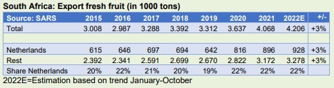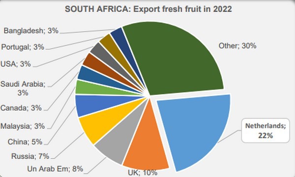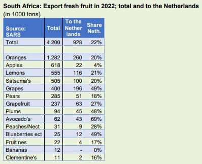 Si bien los Países Bajos importan el 22% de las frutas exportadas por Sudáfrica, la cuota de importación holandesa de aguacates sudafricanos en el mercado internacional asciende a 70%. La mitad de las exportaciones de uvas, ciruelas y arándanos de Sudáfrica se destinan a Países Bajos. Los envíos de cítricos sudafricanos a Países Bajos representan el 20% del total, las peras alcanzan un nivel de 18% y las manzanas solo el 4%.