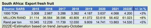 Los datos de este análisis se basan en cifras del Servicio de Impuestos de Sudáfrica (SARS). La estimación para 2022 se basa en las cifras de exportación hasta octubre inclusive. Normalmente, el 95% de los envíos se realiza en los meses de enero a octubre.