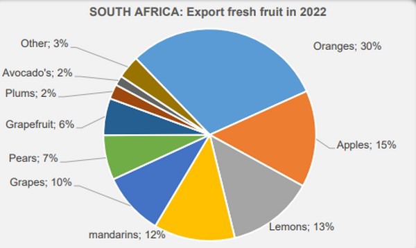 Las naranjas se destinan principalmente a Países Bajos, los Emiratos Árabes Unidos, China y Rusia. La mayoría de las manzanas se exportan al Reino Unido, los países africanos y el sudeste asiático, pero no a China. Grandes cantidades de peras sudafricanas se envían a Rusia y los Países Bajos. Los Países Bajos son, con mucho, el comprador más importante de uvas. Muchos limones se envían a los Países Bajos, al igual que la mitad de todas las exportaciones de arándanos y ciruelas y dos tercios de los aguacates.