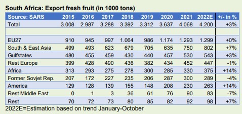 Las exportaciones de frutas de Sudáfrica a la UE se han mantenido estables en un nivel de casi 1,3 millones de toneladas. Sin embargo, los envíos directos a Italia y España se han reducido drásticamente. El Sudeste Asiático ocupa el segundo lugar en el ranking de los destinos de la fruta sudafricana. Este año, las exportaciones a esta región crecieron un 7% hasta unos 0,8 millones de toneladas. En los Estados del Golfo se vendieron 543.000 toneladas (+3%). Después de años de crecimiento, las exportaciones de frutas de Sudáfrica a Rusia se estancaron en 2022 a un nivel de 280.000 toneladas. Los envíos al Reino Unido también se mantuvieron estables en 440.000 toneladas. Por otro lado, las exportaciones a Canadá y Estados Unidos van en aumento, aunque las cantidades son más bien modestas (260.000 toneladas).