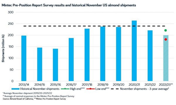 Los participantes del mercado explicaron que la gran diferencia en las estimaciones mostradas en la encuesta eran resultado de la alta variabilidad de ventas de esta temporada, y un exportador de almendras estadounidense señaló: "El consenso del sector se sitúa en torno a las 91.000 toneladas, pero es muy difícil hacer estimaciones esta temporada. Las ventas y los envíos varían tanto entre los manipuladores que parece mucho más aleatorio que en años anteriores".