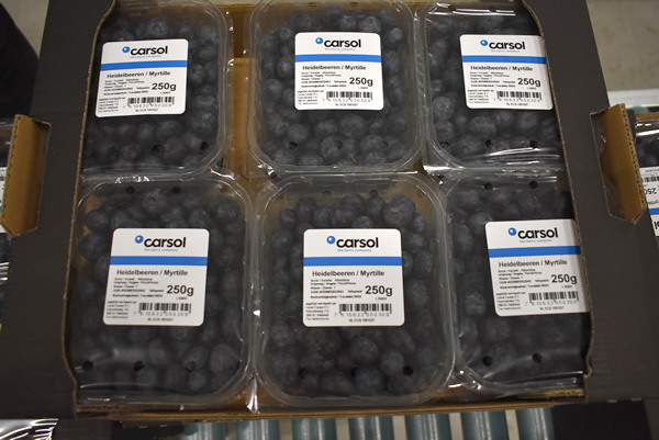 Con unos 45 empleados y tres máquinas clasificadoras de arándanos (de Elifab, Kato y Tomra), IQ Packing clasifica y envasa los arándanos para muchos clientes europeos. Las máquinas son capaces de clasificar y envasar arándanos o cerezas, suministrados a granel, en cualquier tipo de envase. "Procesamos entre 6.000 y 7.000 kilos de arándanos", dice Barry.
