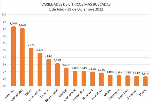Entre el 1 de julio y el 31 de diciembre de 2022, los resultados de las variedades mas buscadas observadas en la plataforma de Naranjasyfrutas.com, que cuenta con miles de cosechas anunciadas, han sido los siguientes: